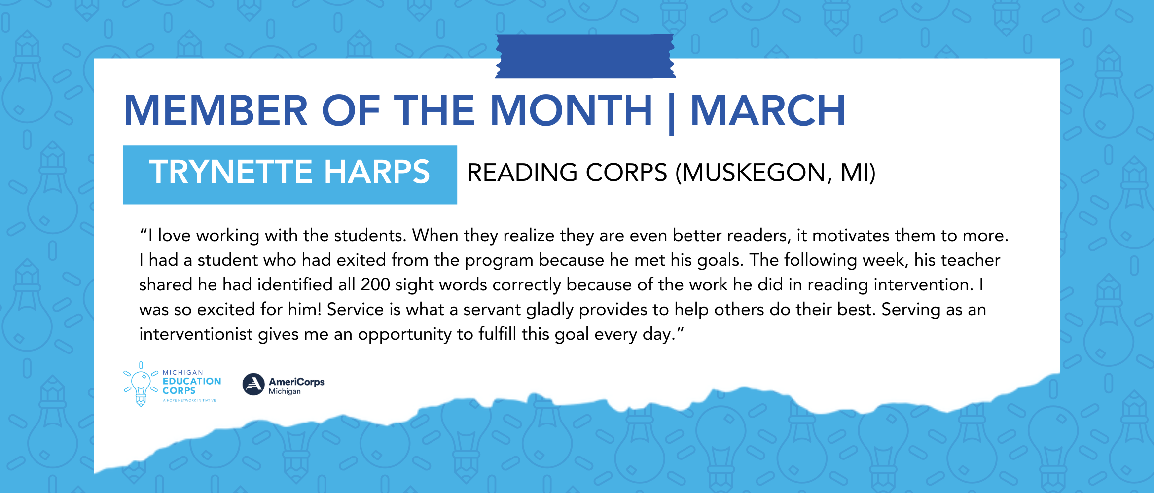 Michigan Education Corps is an AmeriCorps program that has provided reading or math Intervention (often referred to as tutoring) to over 23,000 Michigan children since 2012.